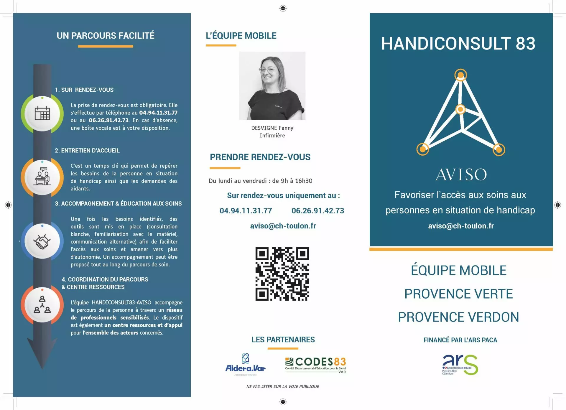 Le projet HANDICONSULT83-AVISO (financé par l’ARS PACA) né d’un partenariat entre le Centre Hospitalier Intercommunal Toulon la Seyne-sur-Mer, l’association AIDERA Var et le CODES 83, vise à compenser l’inégalité d’accès aux soins. Il dispose sur le CHITS de deux lignes téléphoniques et de trois lieux d’accueil dédiés. Des infirmières, formées au sein d’AIDERA Var à l’accompagnement et aux soins de la personne en situation de handicap, ont pour mission d’assurer un accueil adapté et de coordonner le parcours de soins qui a aussi pour vocation d’aider les proches et les aidants à trouver des ressources adaptées.