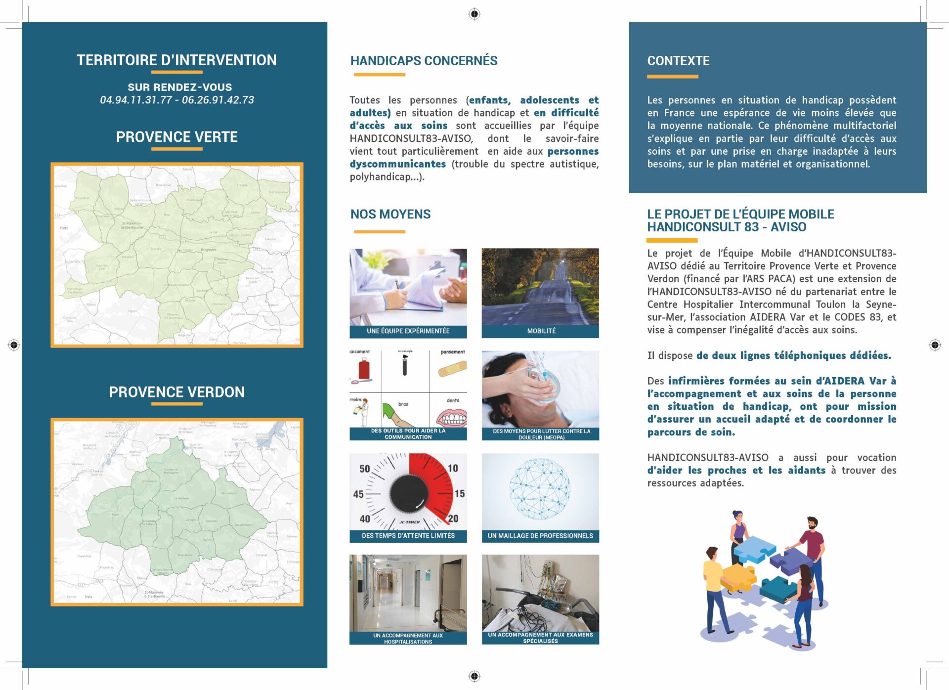 Le projet HANDICONSULT83-AVISO (financé par l’ARS PACA) né d’un partenariat entre le Centre Hospitalier Intercommunal Toulon la Seyne-sur-Mer, l’association AIDERA Var et le CODES 83, vise à compenser l’inégalité d’accès aux soins. Il dispose sur le CHITS de deux lignes téléphoniques et de trois lieux d’accueil dédiés. Des infirmières, formées au sein d’AIDERA Var à l’accompagnement et aux soins de la personne en situation de handicap, ont pour mission d’assurer un accueil adapté et de coordonner le parcours de soins qui a aussi pour vocation d’aider les proches et les aidants à trouver des ressources adaptées.