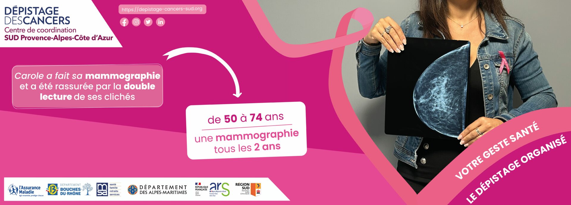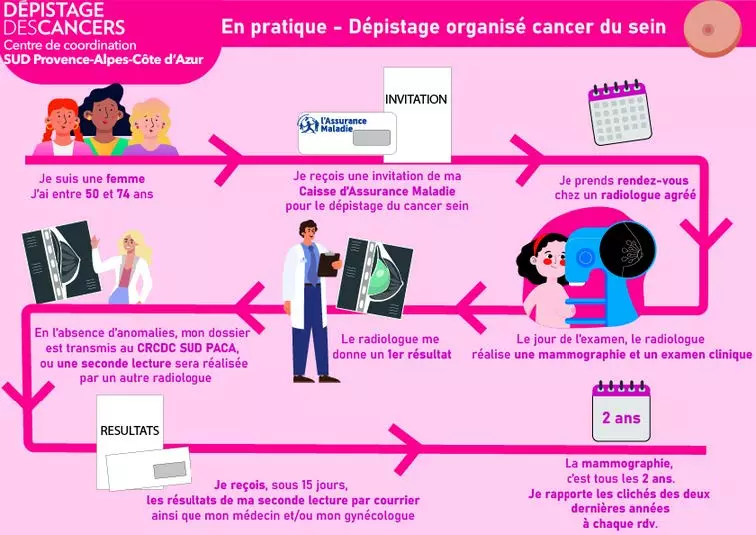 Le dépistage organisé du cancer du sein concerne toutes les femmes de 50 à 74 ans, tous les deux ans, par une mammographie gratuite et prise en charge à 100 %.